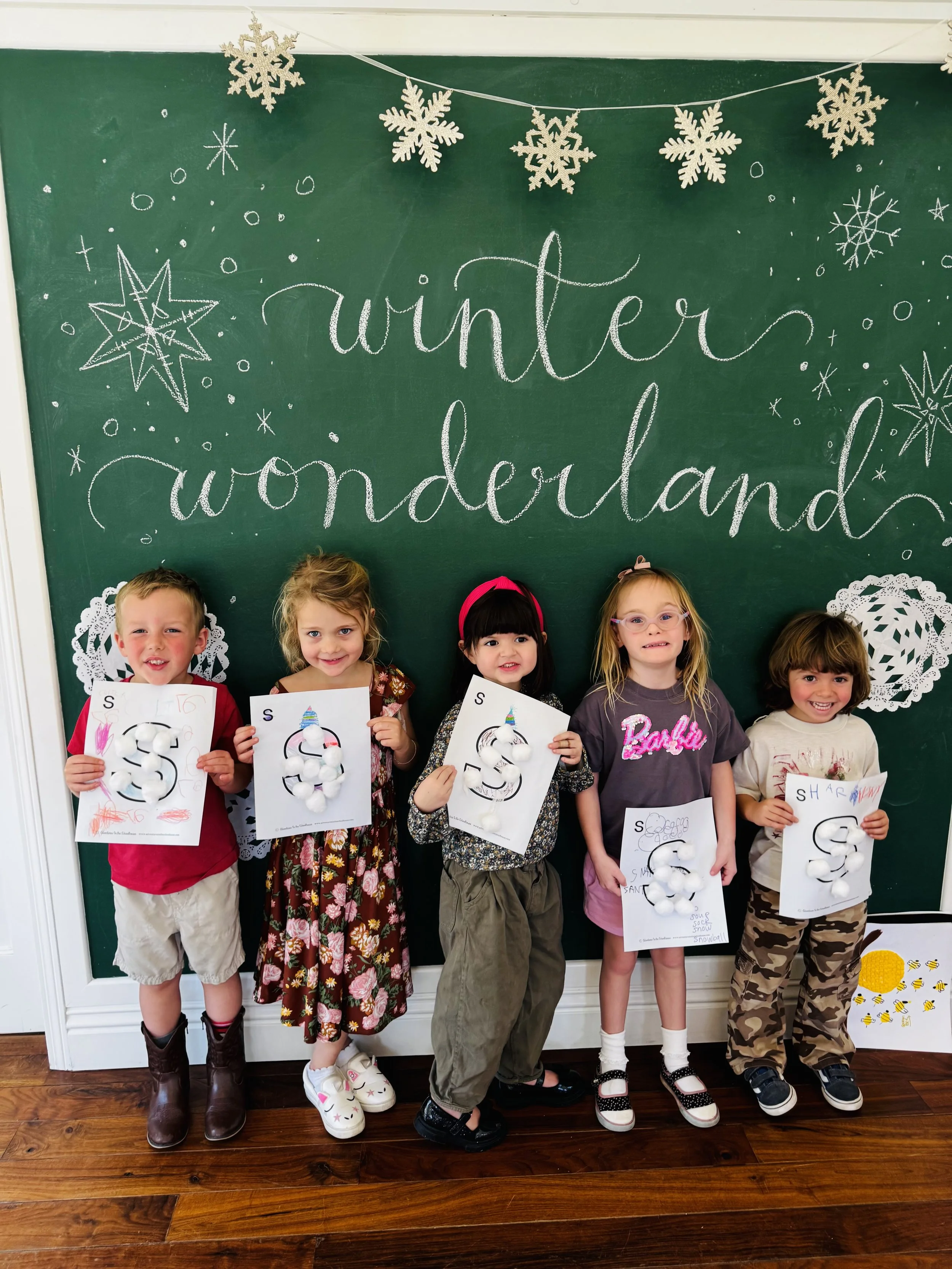 Brainstorming letter “S” words, using cotton balls to reinforce writing letters ✏️, and rolling out homemade snow dough & fresh strawberry 🍓tasting for a multi-sensory experience!